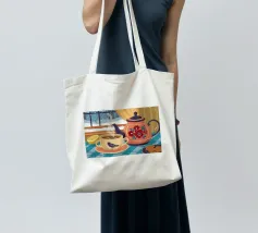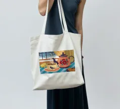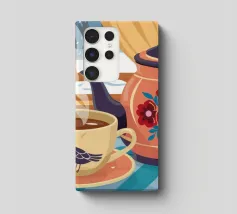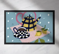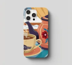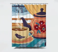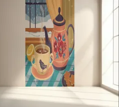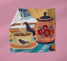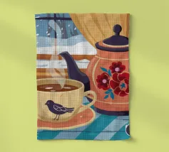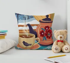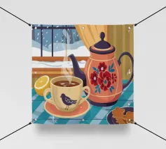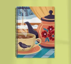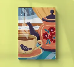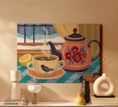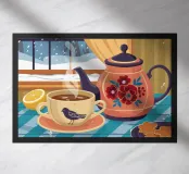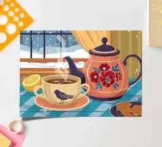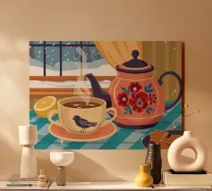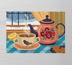 A cozy winter scene viewed from indoors, showing a teapot, a cup with a bird pattern, and a lemon slice on a windowsill looking out onto a snowy landscape.