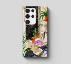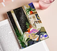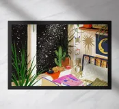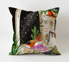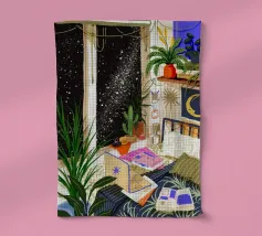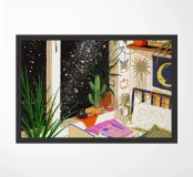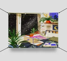 laptop books plants window night sky stars bed pillows potted plants blankets shelf curtains wall art notebook mug string lights cactus space indoor garden decorative cushions