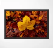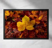 Eine gelbes Ahornblatt liegt auf vielen weiteren Blättern im Herbst.