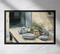 A simple, classic still life of a dining table with a yellow tablecloth, set with a plate and a pitcher. The composition is a serene, minimalist, and beautifully understated depiction of a waiting meal.