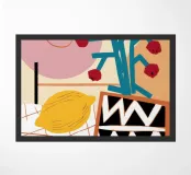 An eclectic abstract collage combines stylized lemons, red berries, and bold black and white geometric patterns, creating a zesty, energetic, and modern composition.