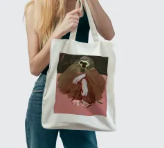 A painted sloth appears on a pink background with a relaxed pose, hanging from a branch. Its distinct facial features are emphasized by deep green eyes and a sizable brown nose, while the strokes of brown and white suggest a furry texture
