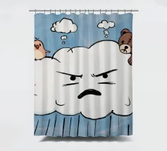 This artwork depicts a grumpy-looking cloud with a thought bubble containing a bird and a bear. The humorous and imaginative scene is set against a soft blue background.