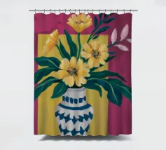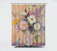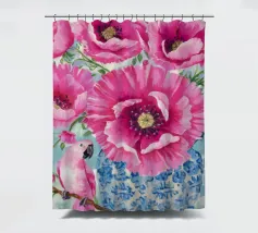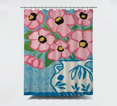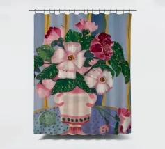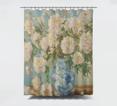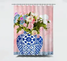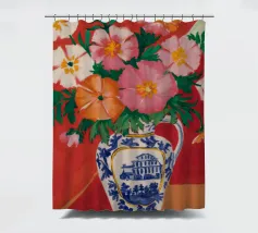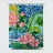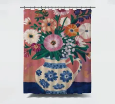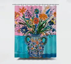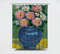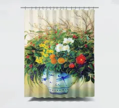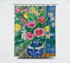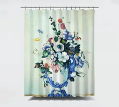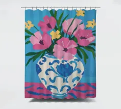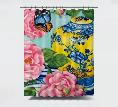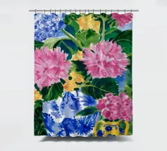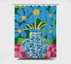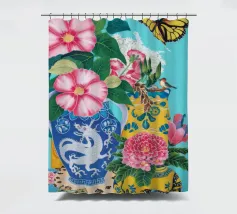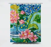A vibrant still life featuring a blue and white patterned vase overflowing with blue hydrangeas and other flowers, with butterflies, against a bright turquoise background.