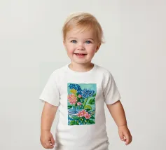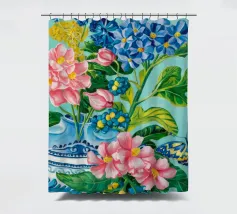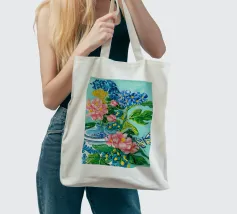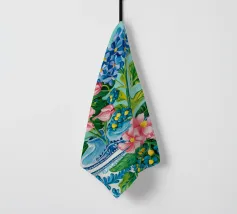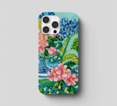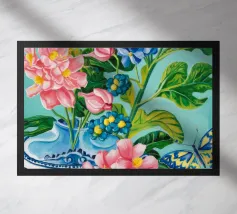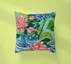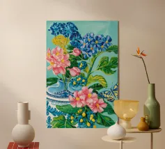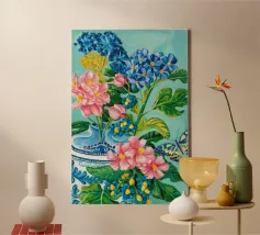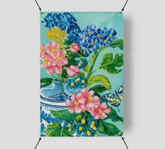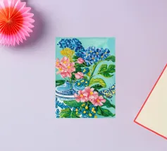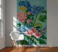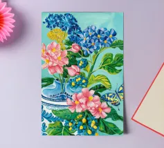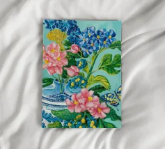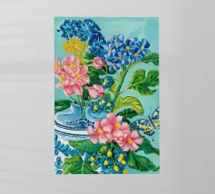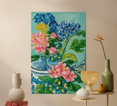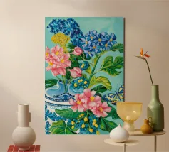 A vibrant still life featuring a blue and white patterned vase overflowing with blue hydrangeas and other flowers, with butterflies, against a bright turquoise background.