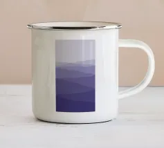 A minimalist depiction shows abstract mountain peaks with mirrored reflections against a soft blue background. The simplistic style emphasizes the jagged edges and serene atmosphere.