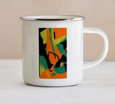 An energetic abstract composition where bold geometric shapes, lines, and patterns in orange, teal, and black collide and overlap, creating a sense of dynamic movement.