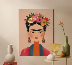 Frida Kahlo shines in this colourful portrait with a flower crown and vibrant colours that celebrates her creative personality and Mexican identity. The watercolour painting perfectly captures the essence of this iconic artist.
