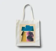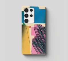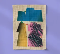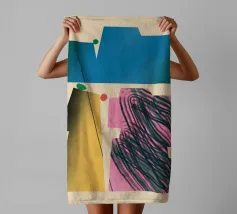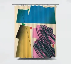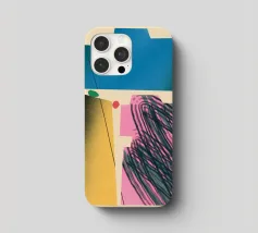 Bold geometric shapes in blue, yellow, and pink contrast against a neutral background. Organic shadows and colorful dots provide a dynamic and abstract composition.