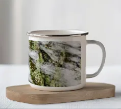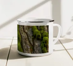The bark of a large tree is adorned with vibrant green moss, intertwined with twisting branches, reflecting the tranquil ambiance of a forest in the early morning light.