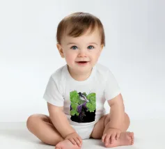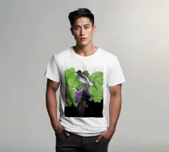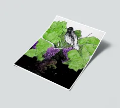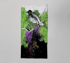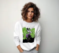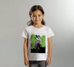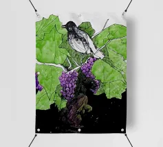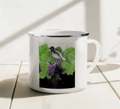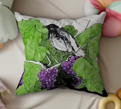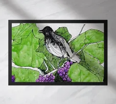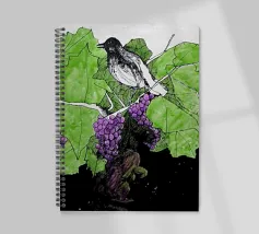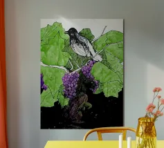 A bird perches on a branch with clusters of purple grapes surrounded by green leaves. The vivid colors of the grapes and leaves create a striking contrast.