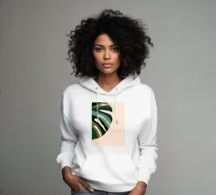The image features an abstract illustration with a large black monstera leaf and a hand outline. The background consists of soft, flowing shapes in shades of beige and brown, creating a harmonious and organic feel.