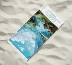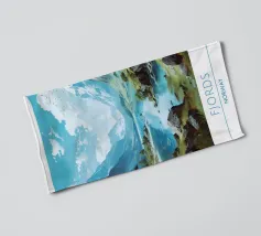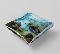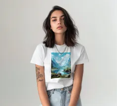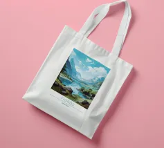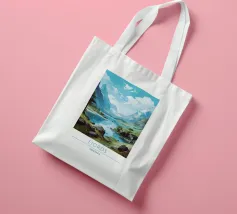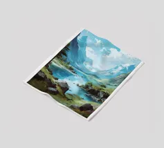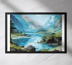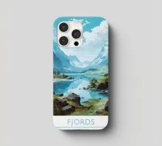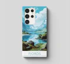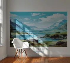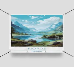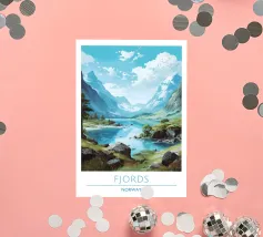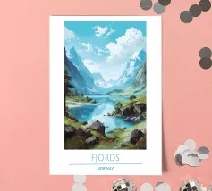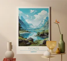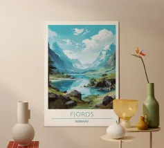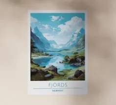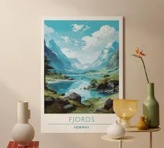 Immerse yourself in the breathtaking majesty of the Norwegian Fjords with this spectacular travel poster. The artwork captures a deep, serene inlet of turquoise water reflecting the towering, snow-capped mountains and dramatic, sheer cliffs that define the landscape. The foreground features mossy rocks and lush greenery, contrasting with the epic scale of the mountains. This high-quality digital poster (7000x5000 pixels, 300 dpi) uses a vibrant, stylized graphic aesthetic to convey the excellent, tranquil, and powerful natural beauty of Scandinavia, perfect for lovers of outdoor adventure and