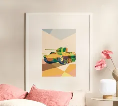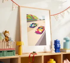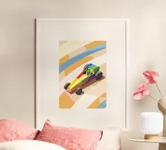 Get an illustration of a colorful car on the road with a modern geometric style.