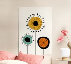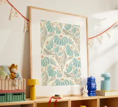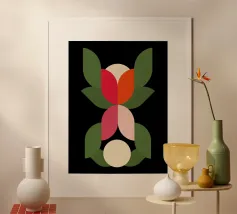 Abstract artwork, where vibrant floral shapes in rich reds, greens, and beiges collide with a cosmic energy. Perfect for adding a bold, modern touch to your home or wardrobe, this unique design shines on canvas, posters, stickers, and apparel. Elevate your space with a piece that blends nature’s beauty with starry inspiration.