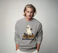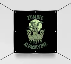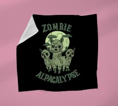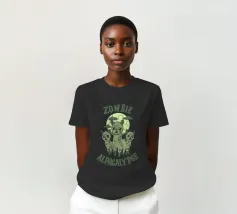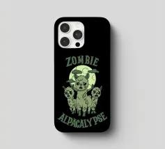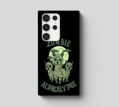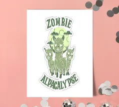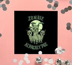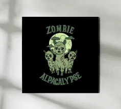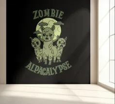 Three zombie alpacas stand under a full moon, their wool torn and eyes empty but oddly cute. This design reimagines the apocalypse with a darkly funny twist — the Alpacalypse has begun! Perfect for fans of horror humor, cute monsters, and anyone who loves weirdly adorable chaos.