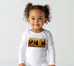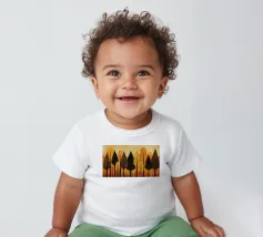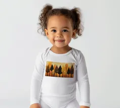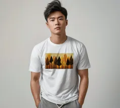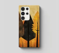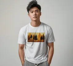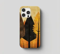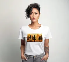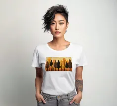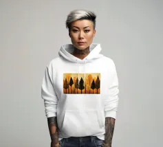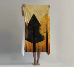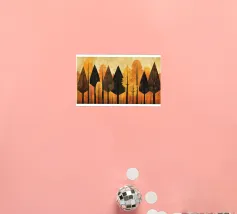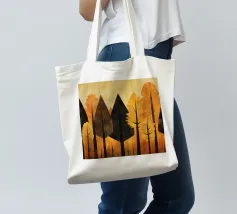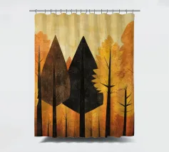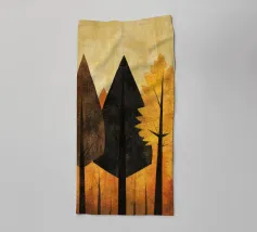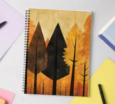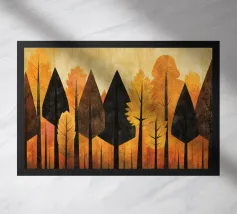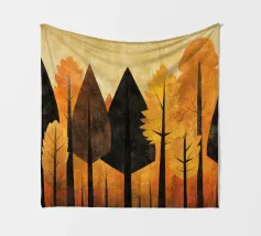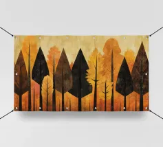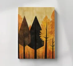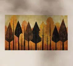 A captivating abstract illustration of a forest featuring stylized trees in rich autumn hues of orange, yellow, and brown. The textured background enhances the warm and seasonal aesthetic.