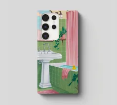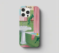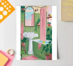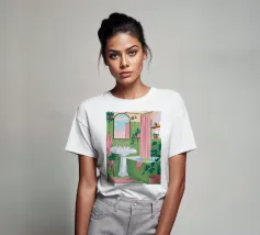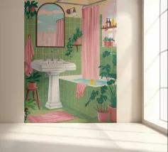 A bright and clean bathroom scene with green tiles, a white bathtub, and a mirror reflecting more of the vibrant space. The room is filled with light, creating a fresh, cheerful, and inviting atmosphere.