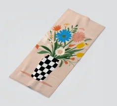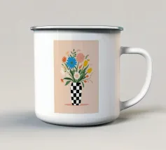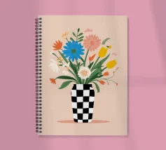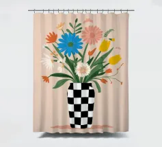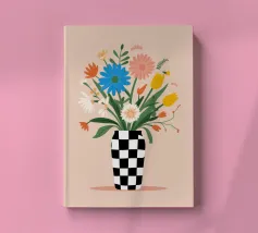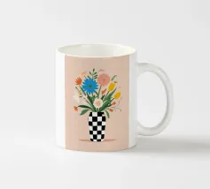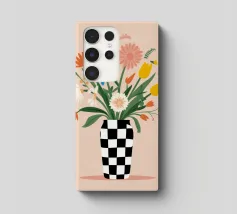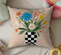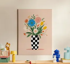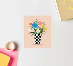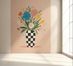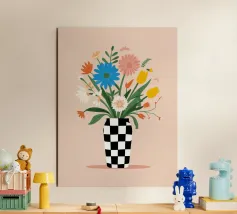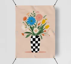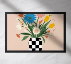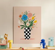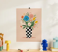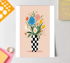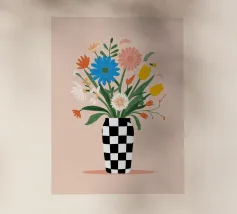 A modern and graphic arrangement of blue and yellow flowers in a black and white checkered vase. The balance of bold pattern and delicate florals creates a stylish and contemporary piece.