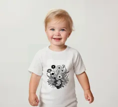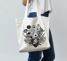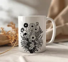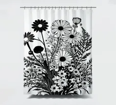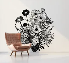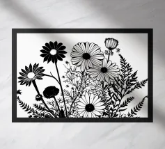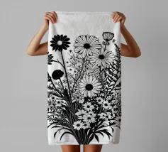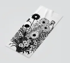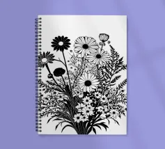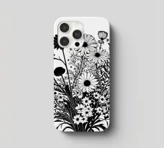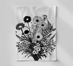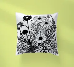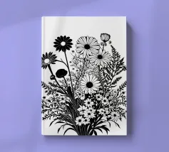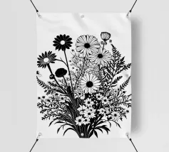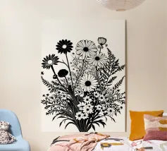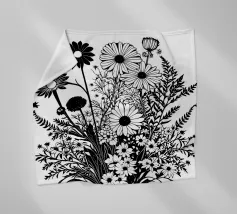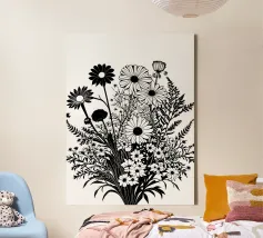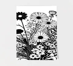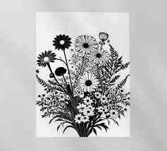 A black and white botanical composition features an assortment of wildflowers and foliage intricately intertwined. The arrangement captures various shapes and sizes, creating a rich tapestry of floral elements.