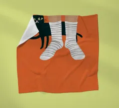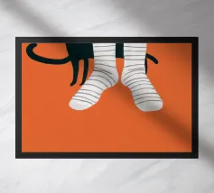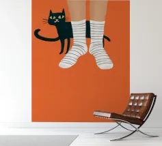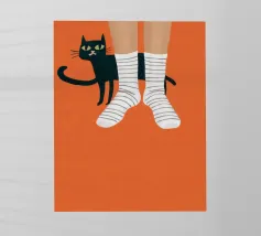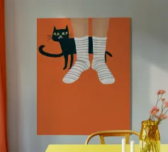 A humorous and charming illustration of a playful black cat attacking the socks on a person's feet. The simple composition against an orange background is a cute, funny, and relatable snapshot of life with a cat.