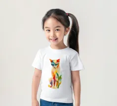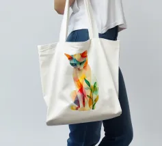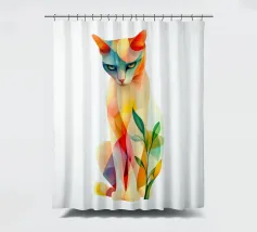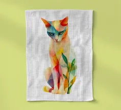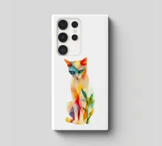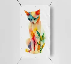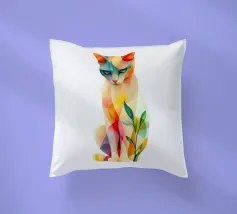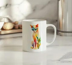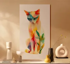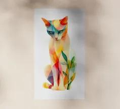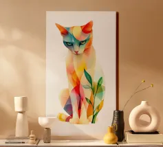 A vibrant geometric illustration of a sitting cat featuring overlapping shapes in dynamic colors, paired with abstract leafy elements for a modern, creative design.