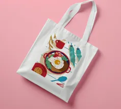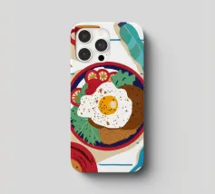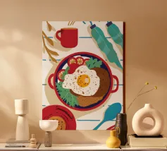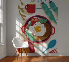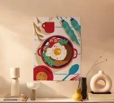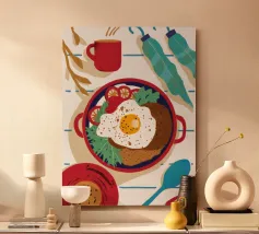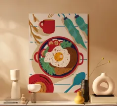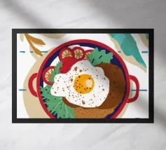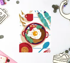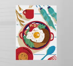 A top down, graphic illustration of a breakfast skillet with a fried egg, surrounded by coffee and tropical leaves, creating a vibrant flatlay composition.