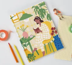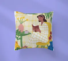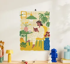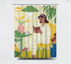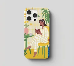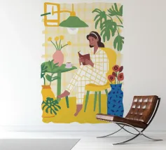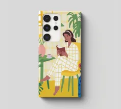 A woman enjoys a moment of quiet contemplation with a drink at a sunlit cafe. The warm light, checkered dress, and surrounding plants create a serene and stylish scene of everyday life.