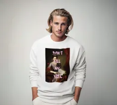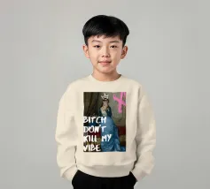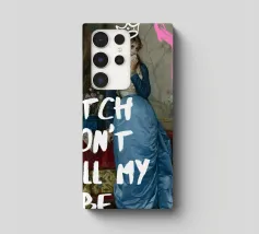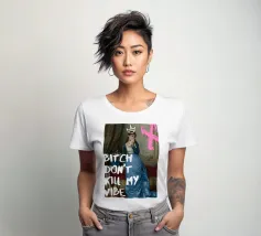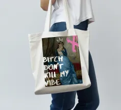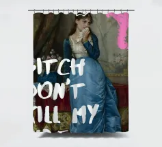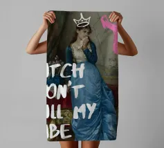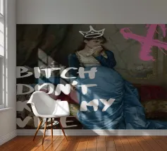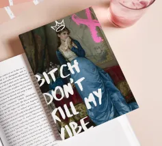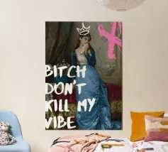 Protect your energy with "Bitch Don't Kill My Vibe," a bold pop art print that combines classical elegance with a modern, assertive message. This striking artwork features an elegant historical figure in a beautiful blue gown, dabbing her eyes with a handkerchief, hinting at emotional depth. A hand-drawn white crown sits atop her head, and a bold pink graffiti-style 'X' adds an edgy touch. The powerful white text "BITCH DON'T KILL MY VIBE" overlays the image, making a confident and unapologetic statement about maintaining positivity. Perfect for adding a touch of artistic empowerment and rebel