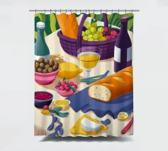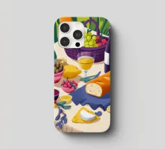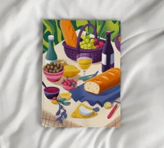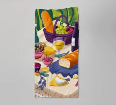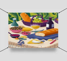 An elegant outdoor dining scene, beautifully set with fresh bread, wine, and fruits, celebrating the joy of shared meals.