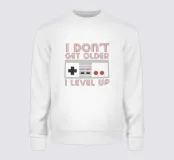 A retro gaming controller is accompanied by the phrase "I don't get older, I level up," using a nostalgic font style. This design combines vintage gaming culture with a humorous take on aging.