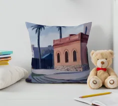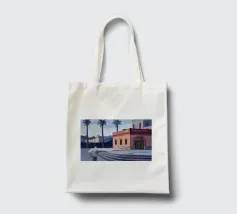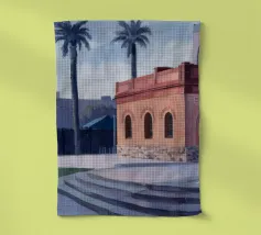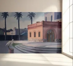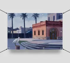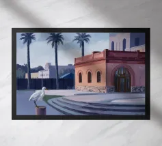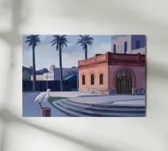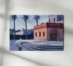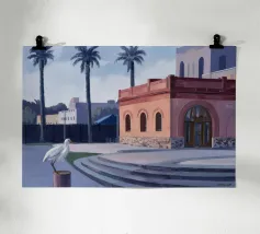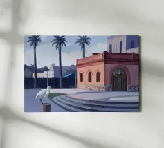 A solitary white ibis stands on the pavement before a sunlit, classic style building with large arches. The long morning shadows and warm light create a scene of quiet contemplation and architectural beauty.