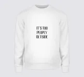 This fun design features the text "IT'S TOO PEOPLY OUTSIDE" in bold, black capital letters on a white background. The font is modern and sans serif, giving the design a clean and contemporary look. The message of the design humorously expresses the feeling of wanting to avoid crowds and crowded places. This simple yet effective design makes this artwork a real eye-catcher that makes the viewer smile while capturing a relatable sentiment.