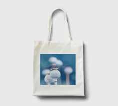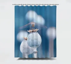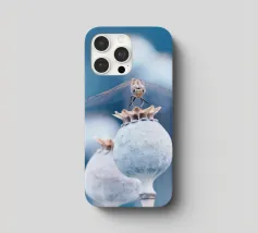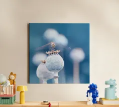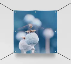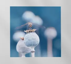 Dragonfly on a poppy seed head (poppy seed capsule) on a blue background