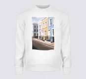 Immerse yourself in the unique atmosphere of London's Notting Hill with this street view lined with houses featuring geometric pastel facades and the elegant Victorian architecture of a British urban landscape.