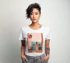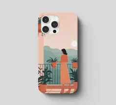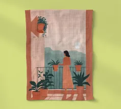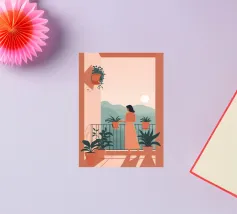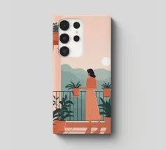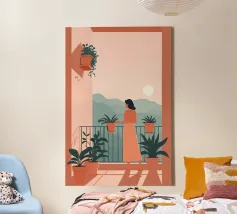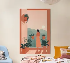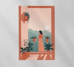 An uplifting minimalist scene of a woman tending to her potted plants on a sunlit balcony. A warm piece that celebrates slow mornings and the beauty of everyday rituals.