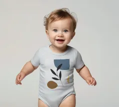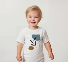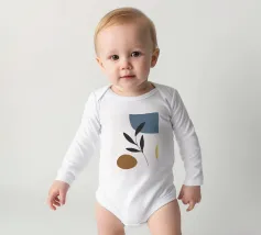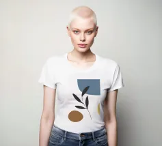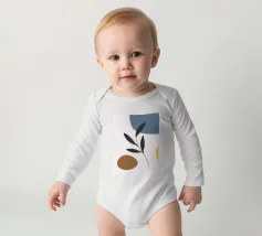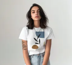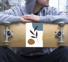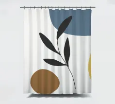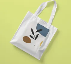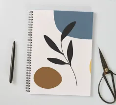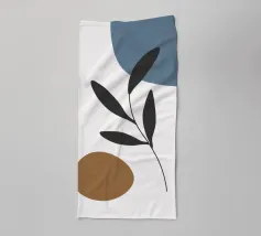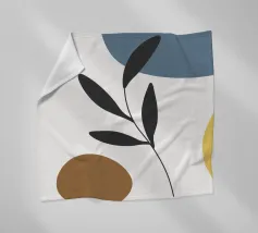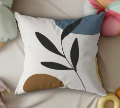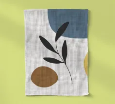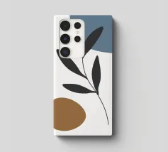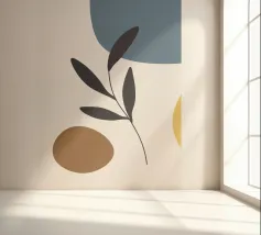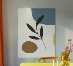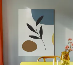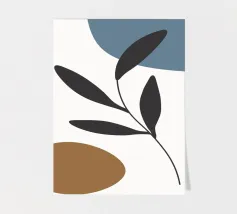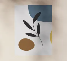 A minimalist composition features abstract shapes in shades of blue, brown, and yellow, combined with a simple black botanical element. The clean lines and subdued color palette create a modern yet natural aesthetic.