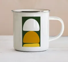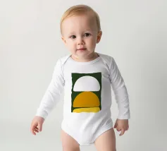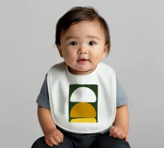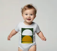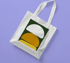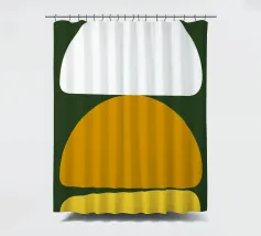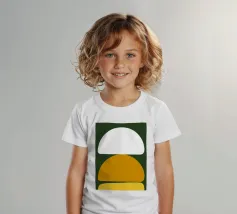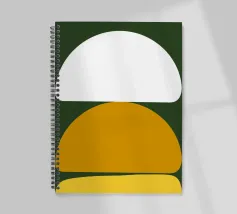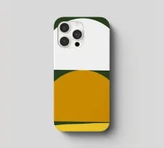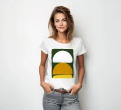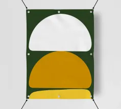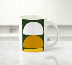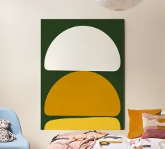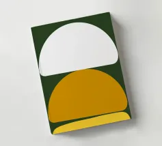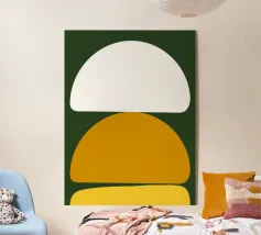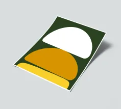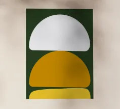 A minimalist design features three semi-circular shapes in white, mustard, and yellow stacked vertically. The simple yet bold use of color and form creates a striking visual contrast.