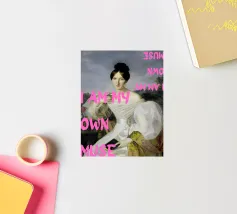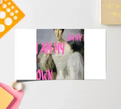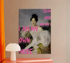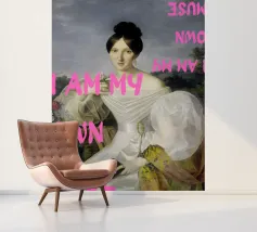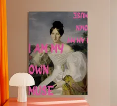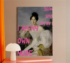 Celebrate self-inspiration with "I Am My Own Muse," a powerful pop art print that combines classical portraiture with a contemporary, empowering declaration. This captivating artwork features a serene historical figure, elegantly posed with a book and a subtle flower, her gaze direct and confident. The bold, hot pink text "I AM MY OWN MUSE" overlays the image in a dynamic, repeating pattern, making an undeniable statement of individuality and self-reliance. Perfect for adding a touch of artistic empowerment and stylish self-love to any modern space. Crafted at an exceptional 7000x5000 pixels r
