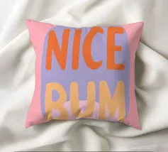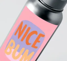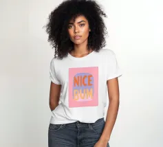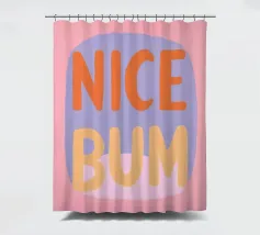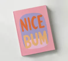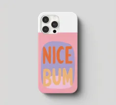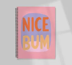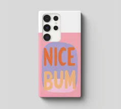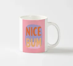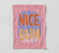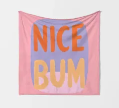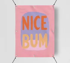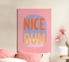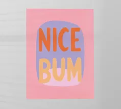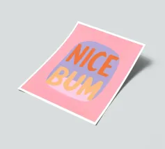 The colourful illustration painting with minimalist typography presents the humorous slogan "Nice Bum" in bold letters. In pastel colours of pink, purple, orange and light blue, the buttocks are creatively staged. This playful depiction celebrates physicality and eroticism in an abstract way.