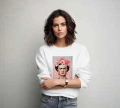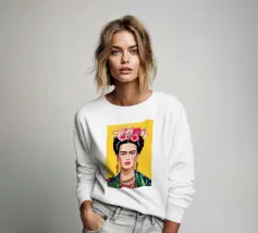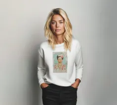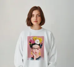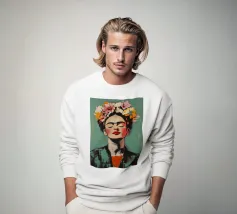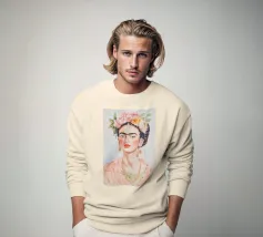 This charming portrait of Frida Kahlo shows her wearing a colourful wreath of flowers and flower earrings, in soft pastel colours, and embodies the combination of Mexican art and feminism.