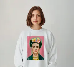 Frida Kahlo enjoys her coffee in a white cup, surrounded by botanical accents. Her flowery headdress and pink fingernails lend the picture a cheerful note and celebrate her love of nature and life.