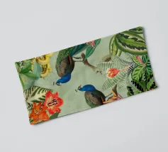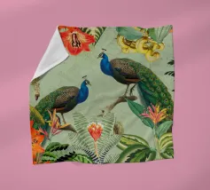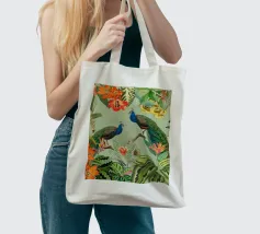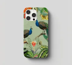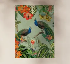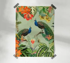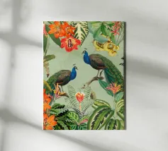 This vintage collage captures the elegance of the tropics with a stunning composition of lush tropical leaves and vibrant fruits. At its heart, two beautiful peacocks stand gracefully, their iridescent feathers shimmering in shades of blue, green, and gold. The peacocks' majestic plumage contrasts against the rich foliage, adding a sense of refined beauty. The subtle vintage textures of the background enhance the overall elegance, while the vibrant colors of the leaves and fruits bring the scene to life, evoking a timeless, exotic paradise.