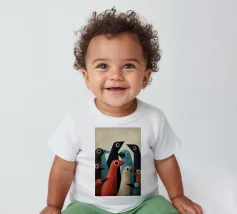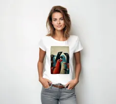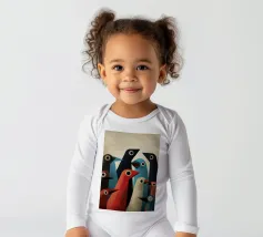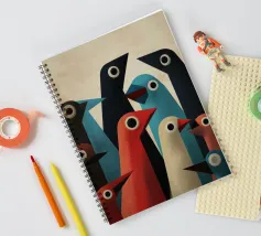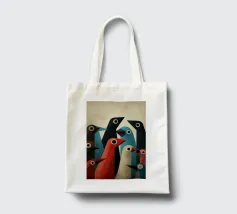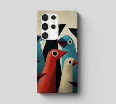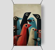 Abstract bird art with geometric shapes and forms in muted colours.