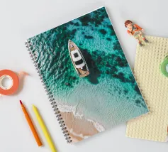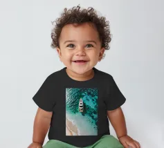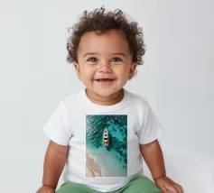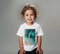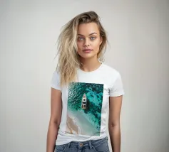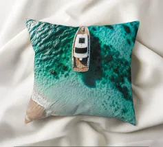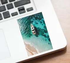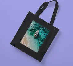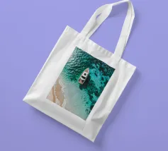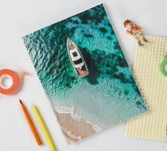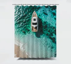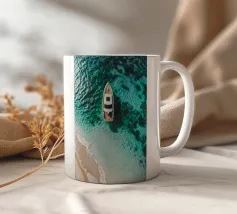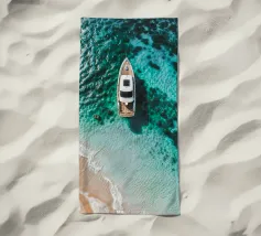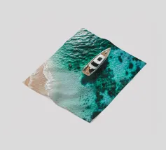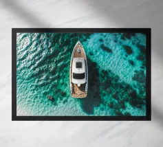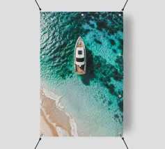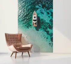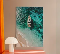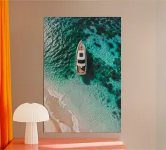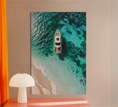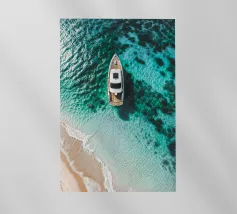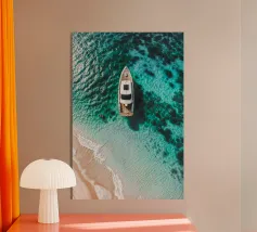 This fascinating aerial photo shows a luxurious yacht over crystal-clear water in a dreamlike colour palette of turquoise, sand and deep blue. The scene exudes pure tranquillity, freedom and maritime luxury - ideal for creating a holiday mood on the wall. Perfect for lovers of ocean photography, beach motifs and modern interior design.