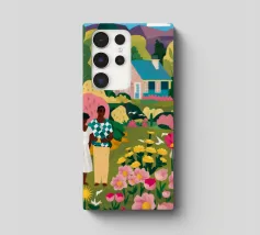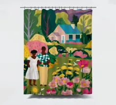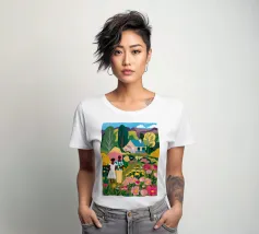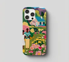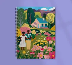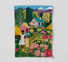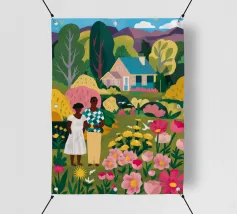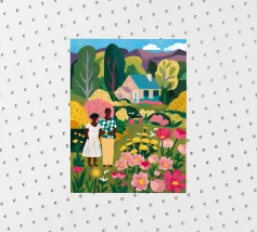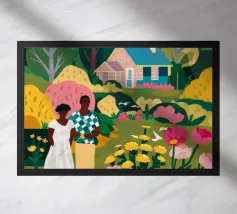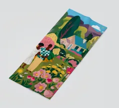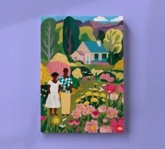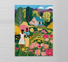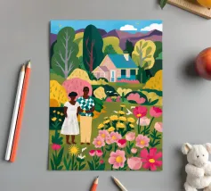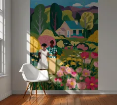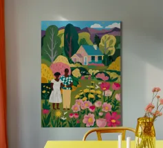 Two figures enjoy a picnic in a field bursting with colorful flowers, celebrating friendship, nature, and the simple joys of a beautiful day.