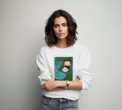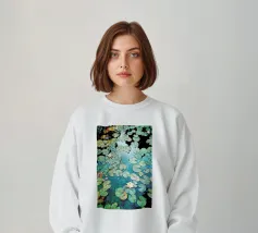 This elegant oil painting shows romantic water lilies in soft pastel green tones reflected in the water, capturing the beauty of nature in a harmonious lake.