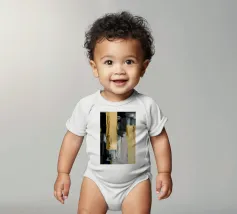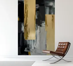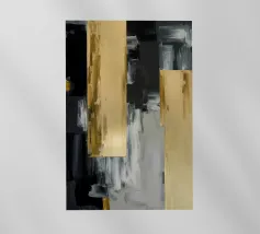 Blocks of black, white, and gold collide in a vertical architectural rhythm.
