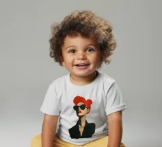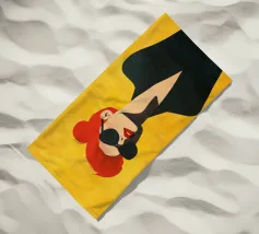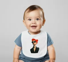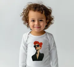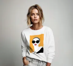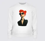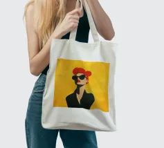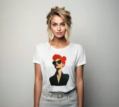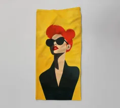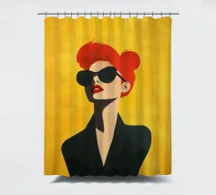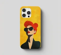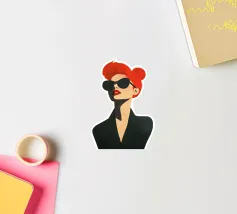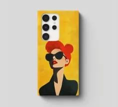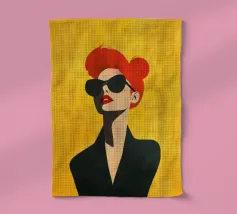 A modern, minimalist illustration of a confident woman with striking red hair, black sunglasses, and a sleek black outfit set against a textured yellow background. The bold, graphic style evokes sophistication and retro charm.
