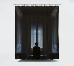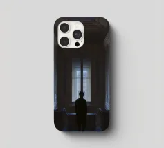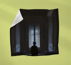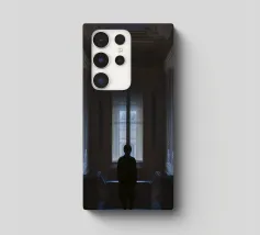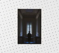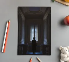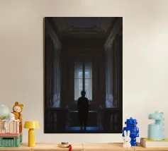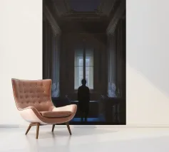 A dark silhouette facing the high windows of Versailles, an intimate and mysterious scene. The classical lines and subdued lighting create a captivating, cinematic atmosphere, transporting the viewer into a moment suspended in time.